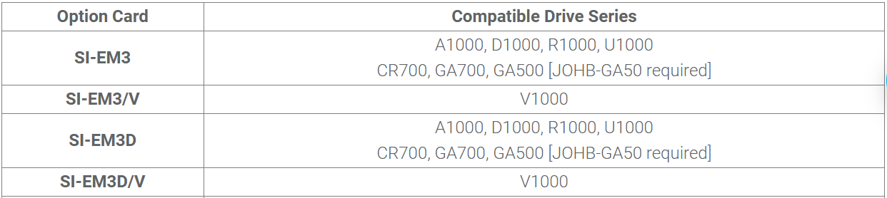 Card truyền thông SI-EM3, SI-EM3/V, SI-EM3D, SI-EM3D/V của Yaskawa là các module mở rộng, được thiết kế để tích hợp vào hệ thống biến tần Yaskawa. Hỗ trợ giao tiếp với giao thức truyền thông công nghiệp tiêu chuẩn Modbus TCP/IP.